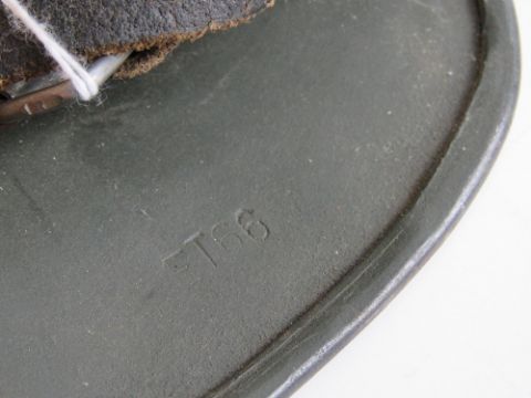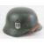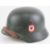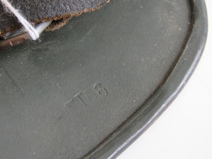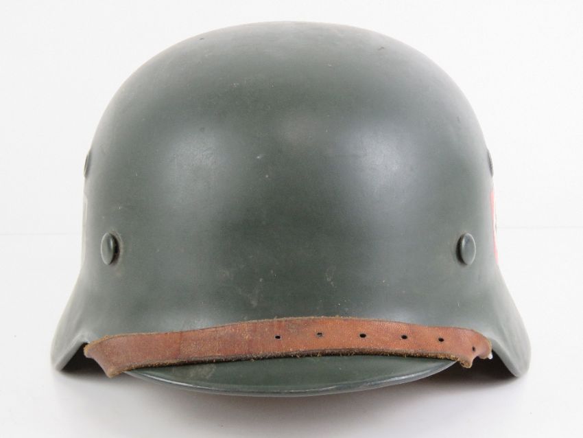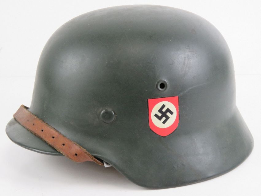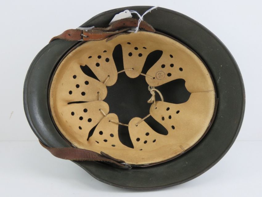 A German over-painted SS double decal helmet, stamped within 5070 ET 66 with leather liner and chin strap, marked R.Larsen Berlin 1938.