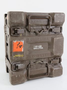 A British Military 7.62 ammo carrier with four ammo tins.
