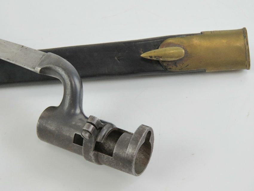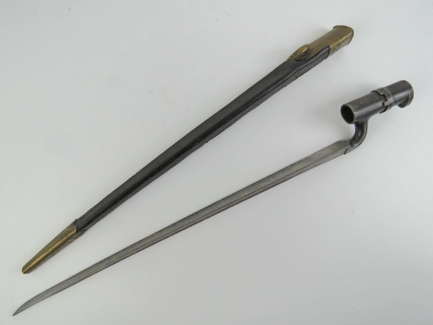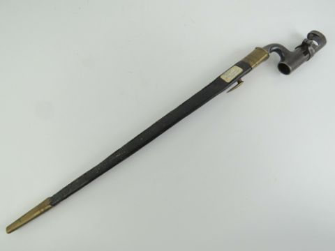 An 1853 British socket bayonet having inspection marks upon with leather and brass scabbard.
