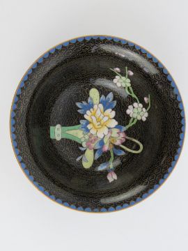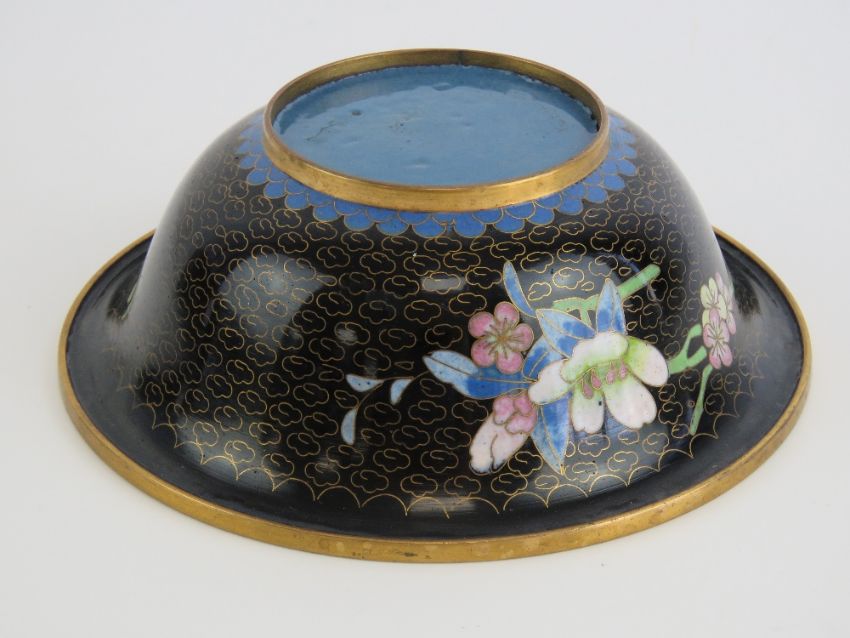A Chinese Canton enamel bowl having black ground with blue border and base, floral decoration to centre, 15.5cm dia.