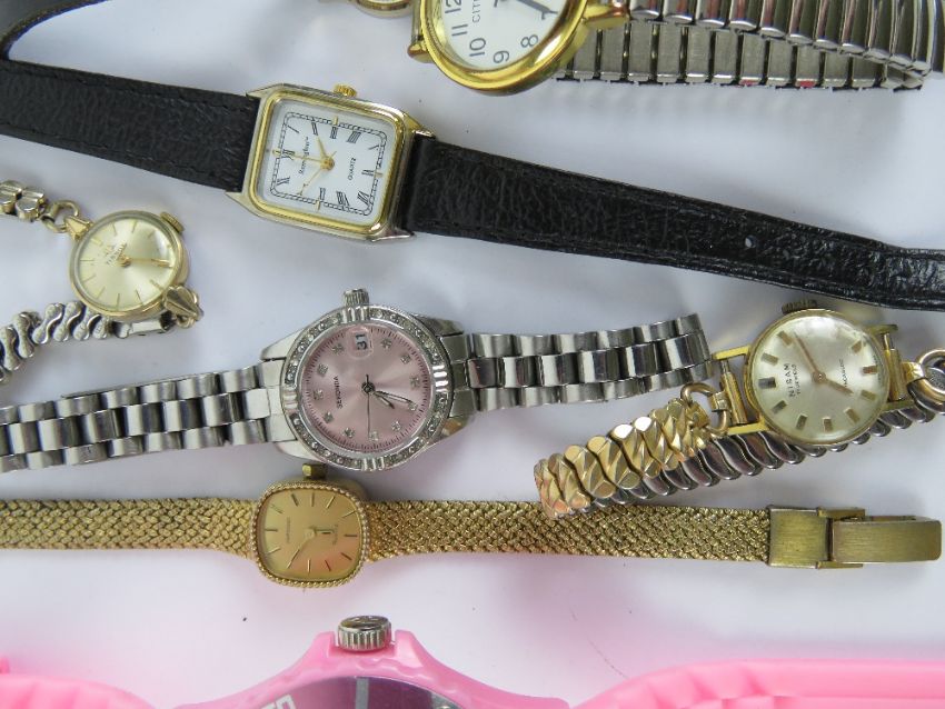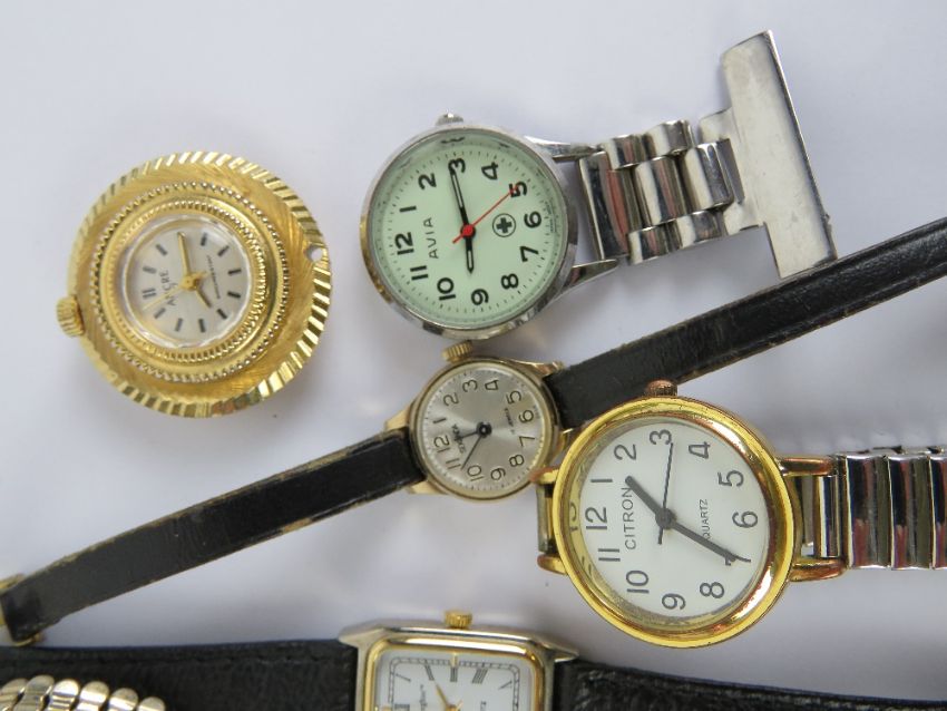 A quantity of ladies wrist watches including; Tissot, Sekonda, stainless steel Sekonda, Avia nurses watch, fob watch having Mona Lisa image to back, etc. Ten items.