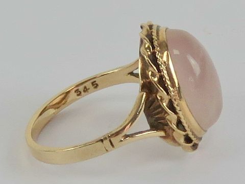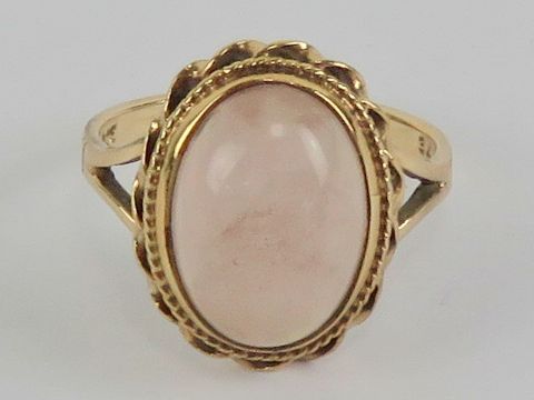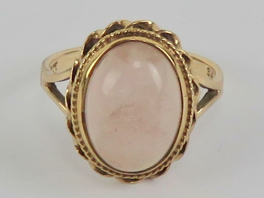 A 9ct gold rose quartz ring, the central oval cabachon measuring approx 14 x 10mm, stamped 9ct, size O, 4.2g.