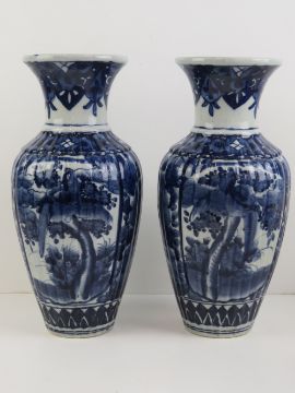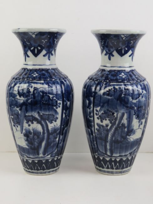 A good pair of 19th Century heavy oriental export blue and white ribbed shoulder vases, each standing 38cm high.