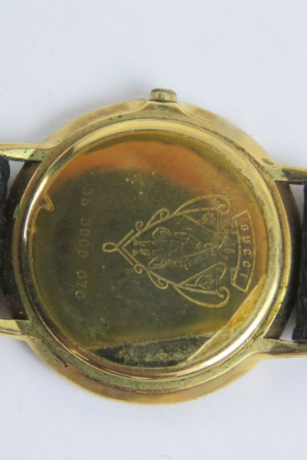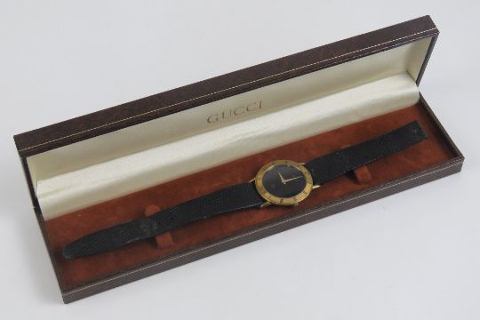 A Gucci wristwatch having yellow metal chapter ring with black dial, strap a/f, with box.