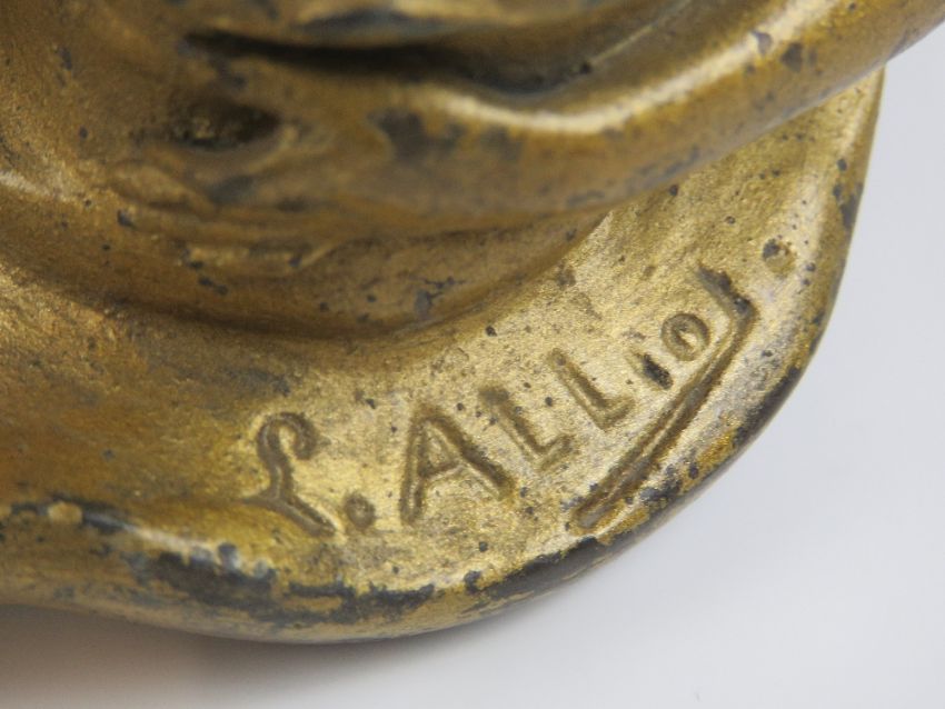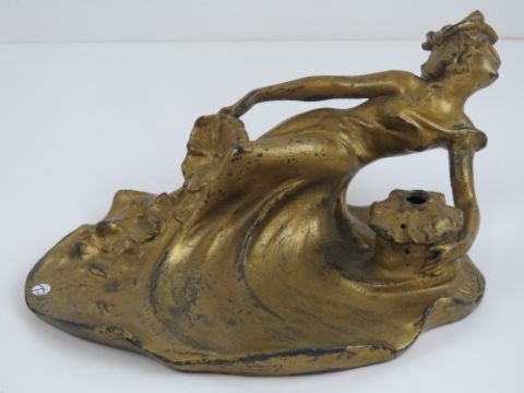 A gilded spelter Art Nouveau inkwell in the form of a recumbent female, 20cm wide, inkwell insert deficient.