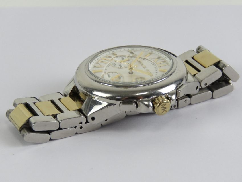 Michael Kors; a stainless steel wristwatch, MK-5653, on original strap with box, pouch and booklet, white dial with three subsidiary dials and date aperture.