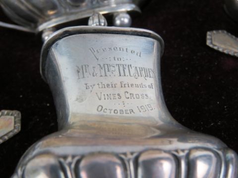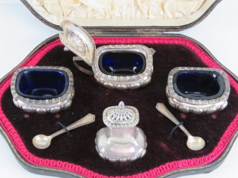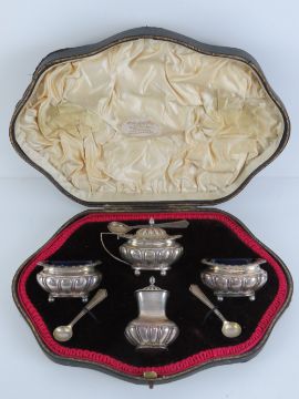 A superb HM silver cruet set in original fitted silk and velvet lined case, comprising pepper, twin salts with spoons and Bristol blue glass liners, and lidded mustard pot having spoon and Bristol blue glass liner. Pepper engraved 'Presented to Mr & Mrs T.F. Carden by their friends of Vines cross October 1919'. Hallmarked for Levesley Brothers (Central Works, Mary Street, Sheffield) Sheffield/London 1902. 7.1ozt.
