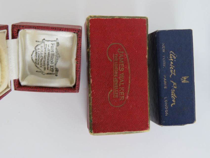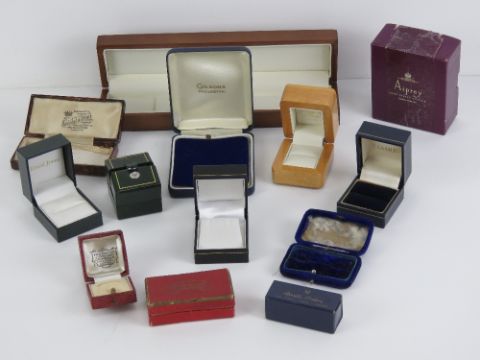A quantity of vintage and contemporary jewellery boxes including wooden bracelet box, Elizabeth Arden, Asprey, etc. Thirteen items.