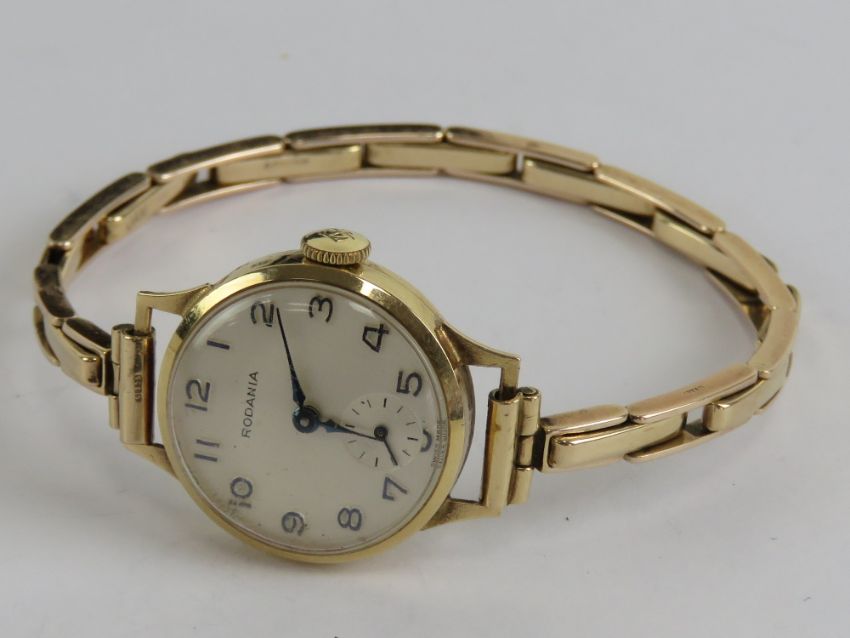 A 9ct gold Rodania ladies wristwatch on 9ct gold expanding bracelet strap, Swiss manual movement, silvered dial with subsidiary seconds dial and blued steel hands, hallmarked 375, total weight 17.4g.