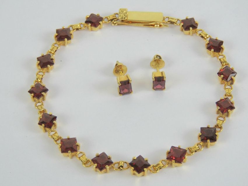 A 14ct gold and garnet bracelet, the 14 square cut garnets each approx 0.6ct and claw set upon articulated chain, clasp stamped 585, measuring 20.5cm in length, weighing 10.9g. Together with a pair of 14ct gold and garnet earrings to match, screw on butterflies marked 585, 1.5g. Total weight 12.4g.