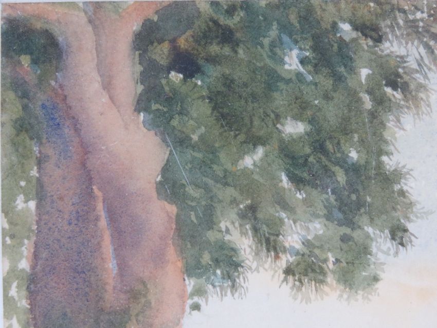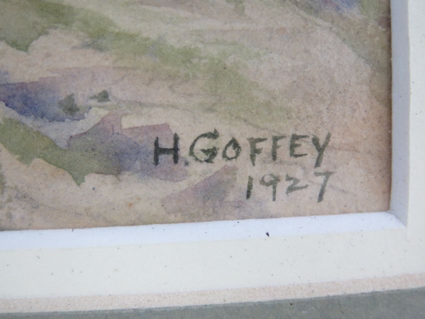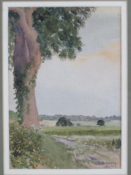 Watercolour; a delightful country lane scene, trees before, fields and woodland beyond, signed H Goffey 1927, 20 x 14cm.