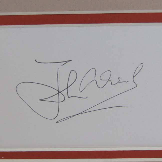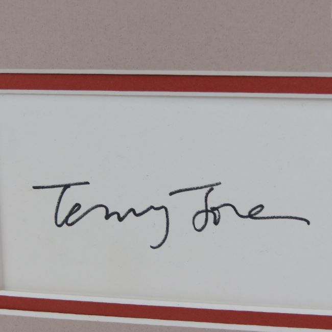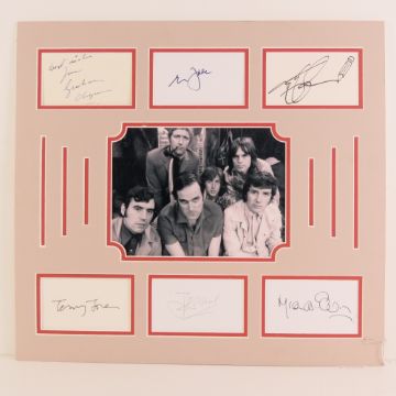 A Monty Python photographic signed montage of all six 'pythons' Graham Chapman, Eric Idol, Michael Palin, Terry Jones, Terry Gilliam (a very rare signature), and John Cleese, measuring 47 x 50cm