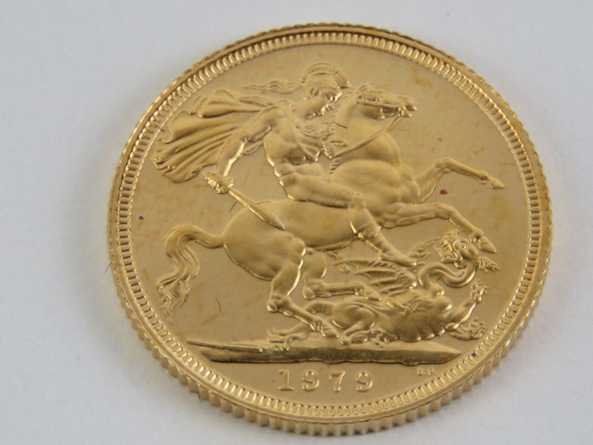 A Royal Mint 22ct gold full sovereign, Elizabeth II 1979, 8g. In original presentation packaging.