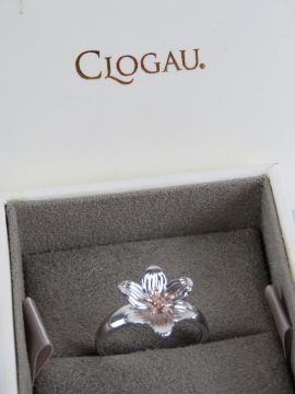 A Clogau silver ring in flower design with central diamond set in Welsh rose gold, hallmarked 925, size P, as new in presentation box.