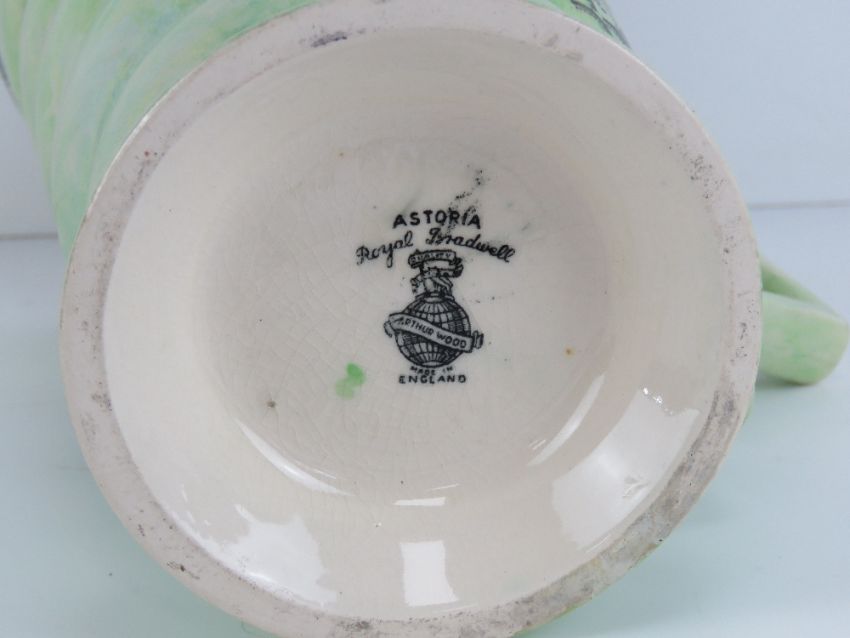 A green lustre Astoria pattern jug made by Arthur Wood Royal Bradwell Works, having floral decoration upon and standing 25cm high.