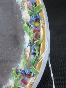 A late 19th century Continental floral encrusted oval easel mirror decorated with cherubs upon, 25cm high, a/f.