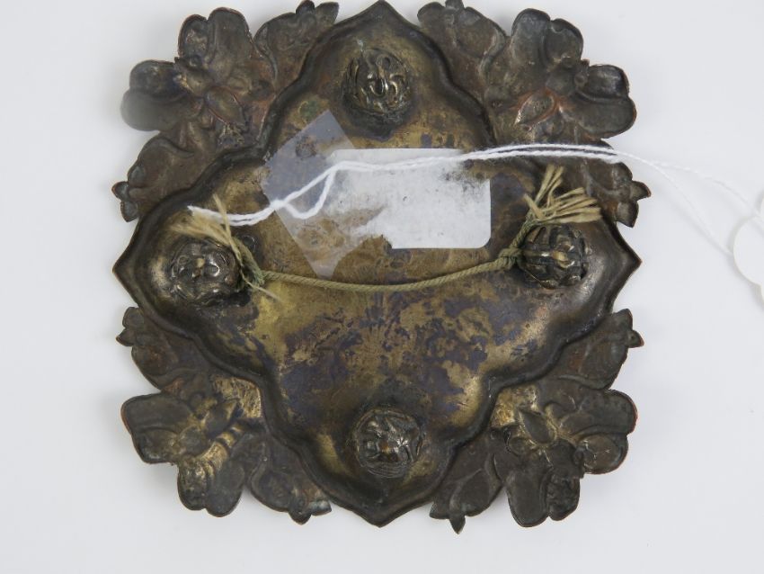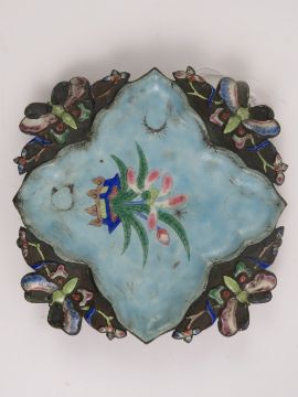 A brass and enamelled quatreform dish decorated with dragonflies and flowers upon, 12cm dia. Together with a brass handled dish with hand painted handle. Two items.