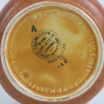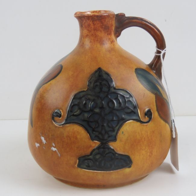 A Chameleon ware hand painted bottle vase with handle decorated in relief, standing 16cm high.