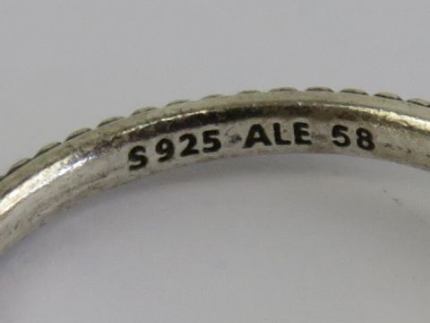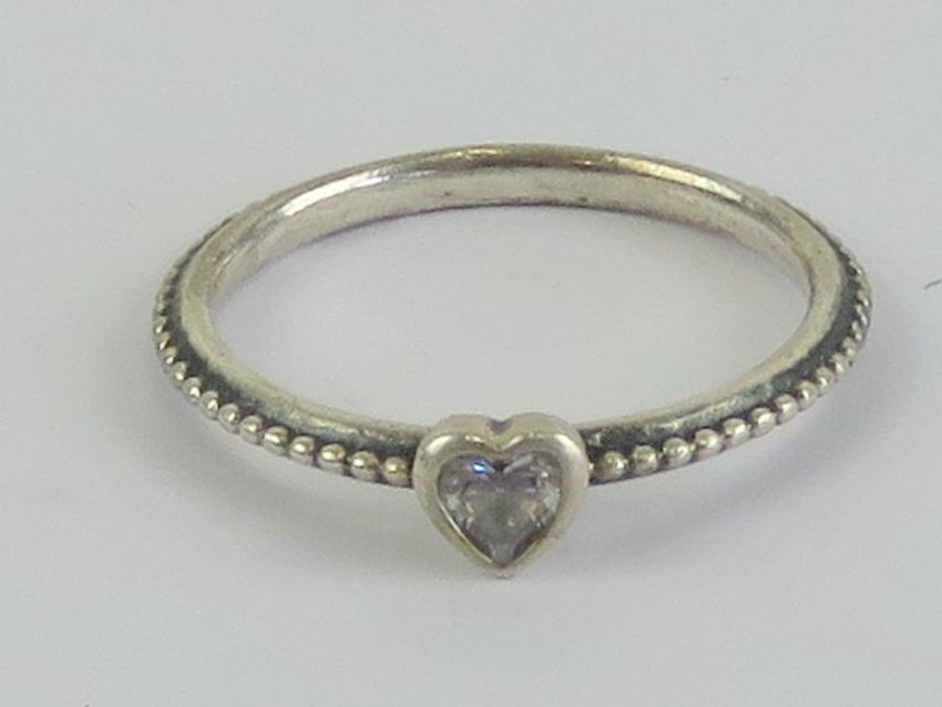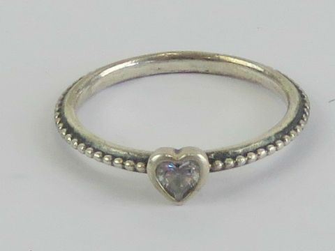 A silver Pandora ring having heart set with white stone to centre, marked S925 ALE 58, in presentation box. Size Q-R.