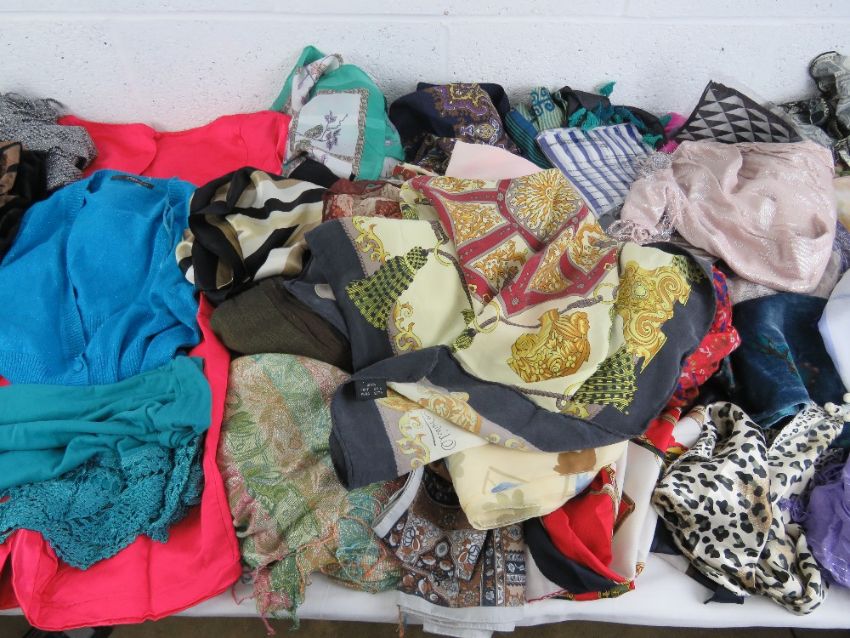A quantity of assorted silk scarves, handbags, pashminas etc.