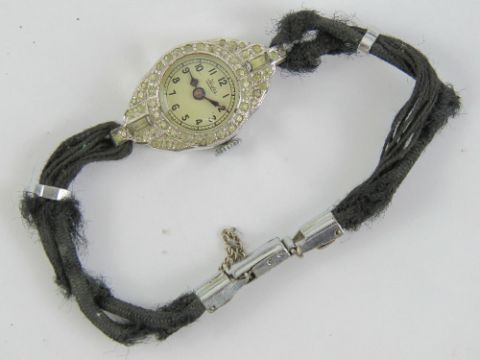 A vintage French cocktail watch encrusted with white stones and engraved Nell 1941, strap a/f.