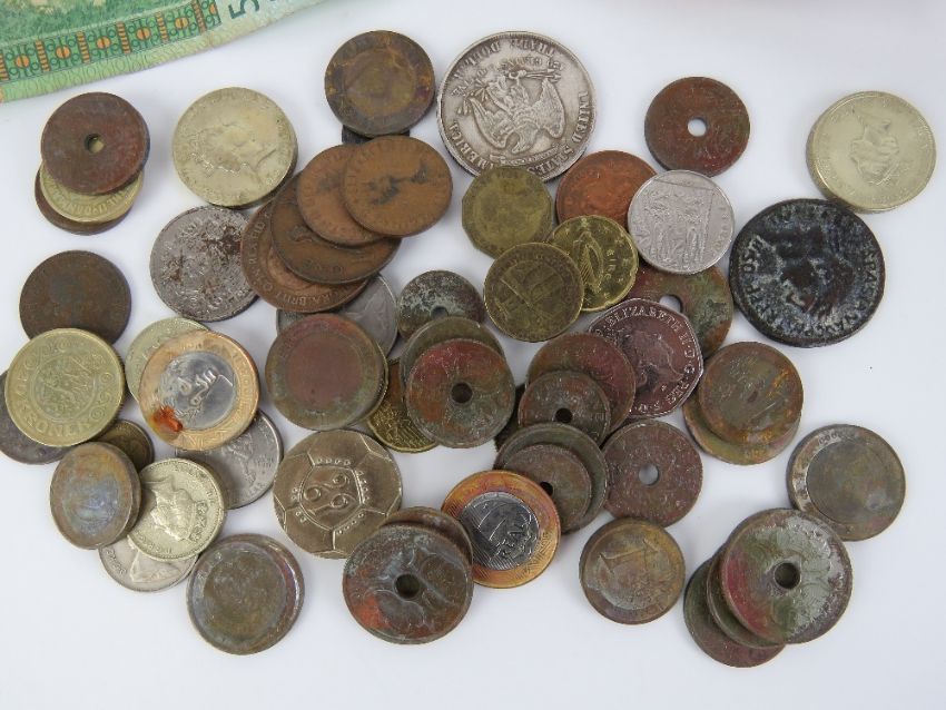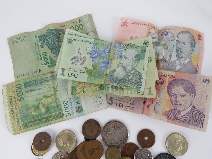A quantity of Romanian and West African bank notes, together with a quantity of 20th century coinage including; Denmark Kroner, Brasil Real, Turkish Lirasi, reproduction Roman coin, a replica trade dollar, etc.