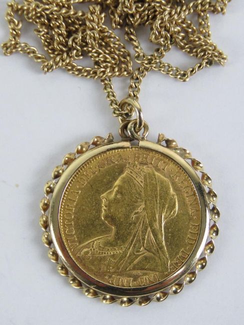 A 22ct gold full sovereign, Victoria 1899, 8g, in yellow metal pendant mount, with 9ct gold hallmarked chain necklace measuring 51cm. Total weight 14.6.