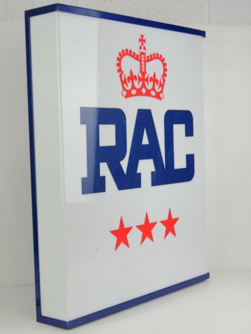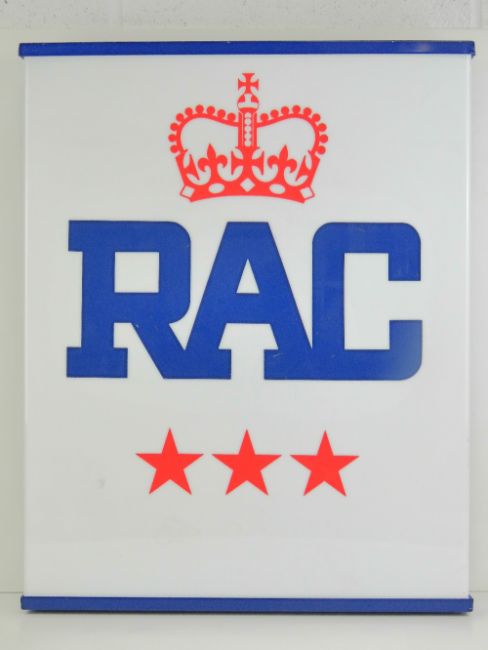 A rare and original 20th century fully illuminated Royal Automobile Club (RAC) wall sign bearing crown and logo measuring 66 x 54cm.