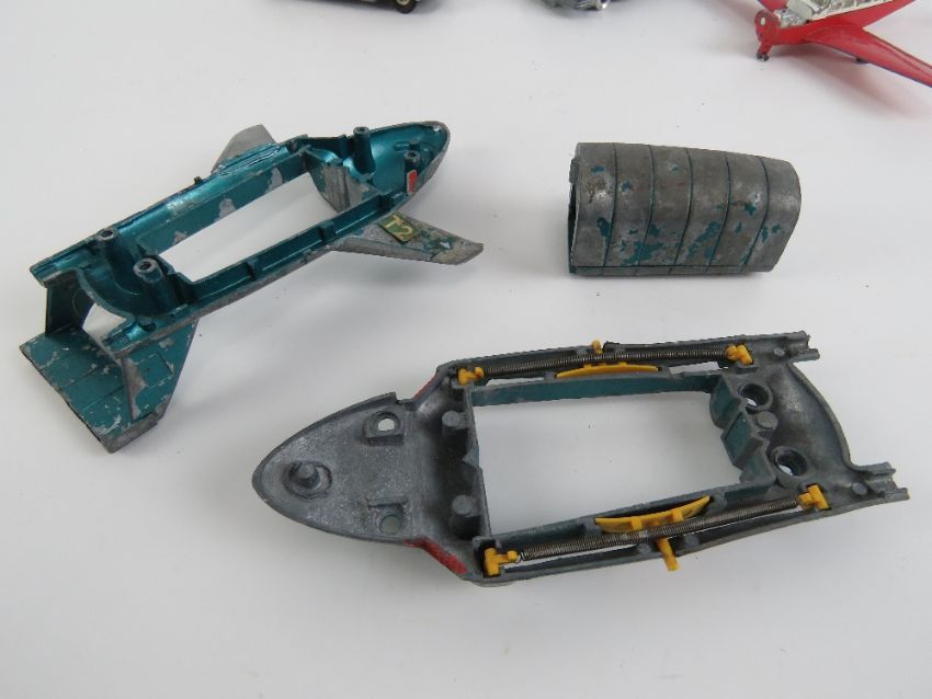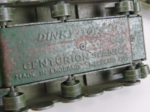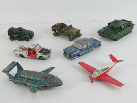 Seven assorted Dinky Toys in play worn condition including; Thunderbird 2, Centurion Tank, Armoured Personnel Carrier, Ford Cortina, Mercedes 250SE, US Jeep, and Beechcraft S 35 Bonanza plane.