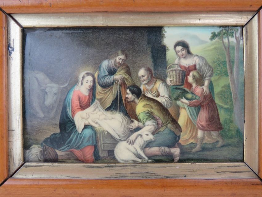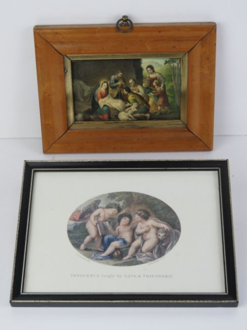 Coloured print on celluloid, biblical stable birth scene, in moulded maple frame, all measuring 17 x 22cm. Together with a coloured print 'Innocence taught by love and friendship' by Bartolozzi.