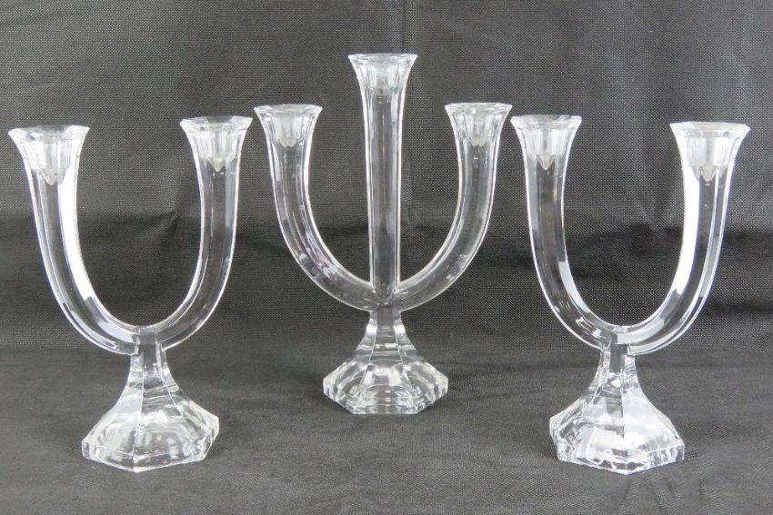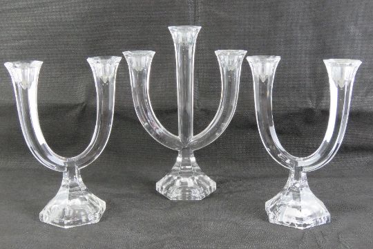 A pair of Nachtmann twin branch glass candelabra, each standing 24cm high, together with matching Nachtmann three branch glass candelabra standing 28.5cm high. Three items.