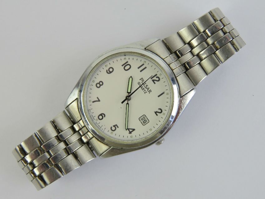 A Pulsar stainless steel wristwatch with original instructions booklet, white dial with date aperture, marked Japan VB37-800WRZ.