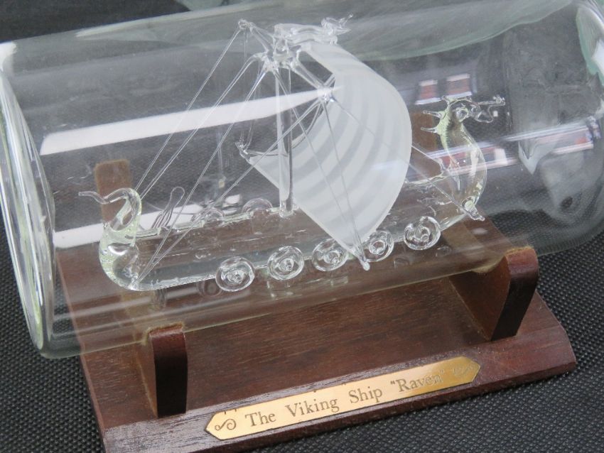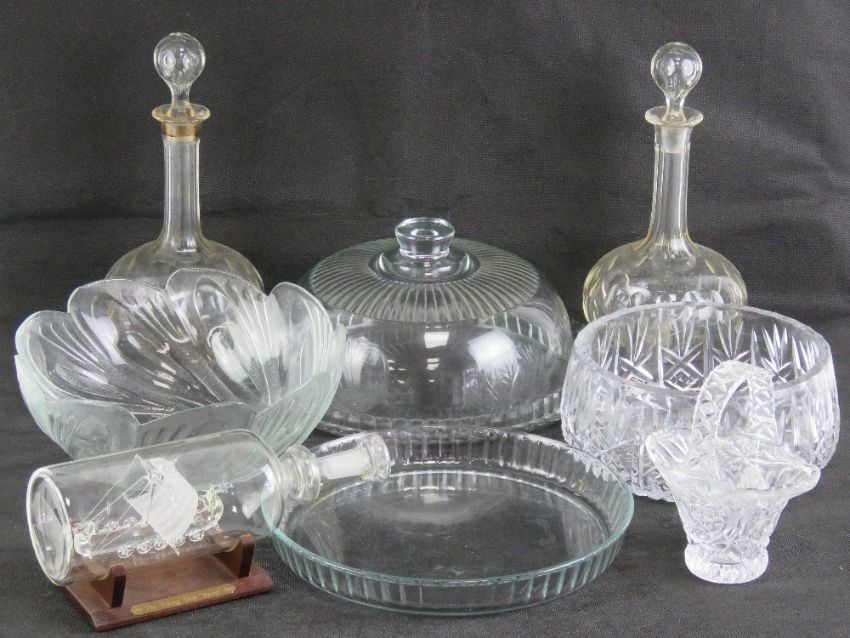 A glass Viking ship in a bottle with plinth, together with assorted glassware including pair of decanters with stoppers, cake plate with cover, Pyrex pie dish, etc.