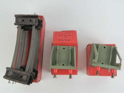A Hornby 0 gauge box, half dozen curved half rails in original box, together with two number one buffer stocks both in original box.