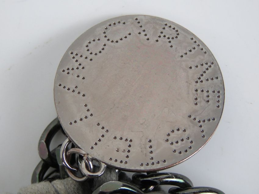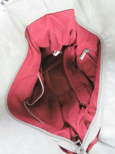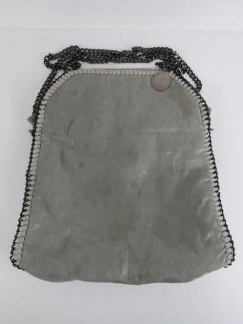 A grey suede ladies handbag with chain detail, 38cm wide.
