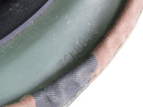 Two helmets one having camouflage fabric cover.