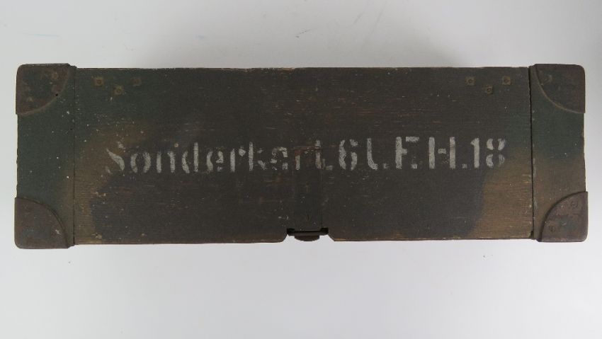 A WWII German Flak18 shell wooden transit chest having camouflage paint finish.