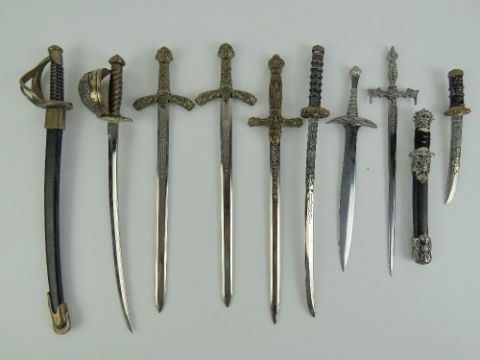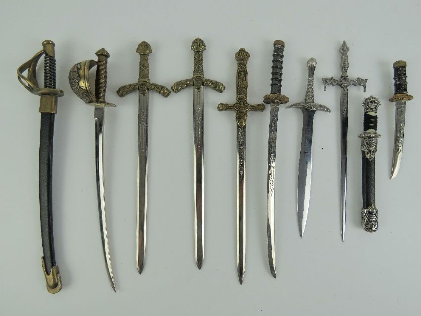 A miniature decorative sword modelled on US 1860 pattern with leather sheath, total length 26cm, together with nine other assorted miniature decorative swords.
