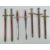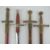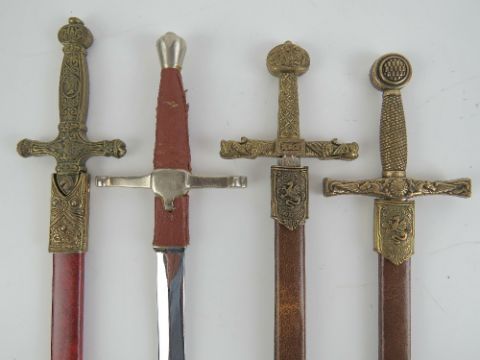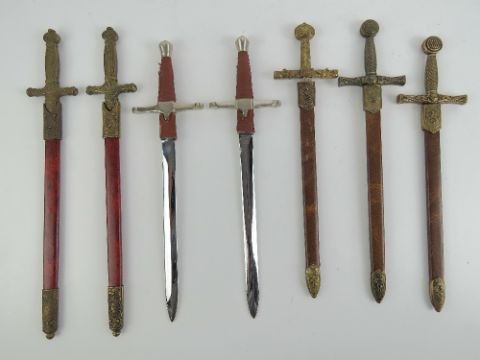 Five miniature decorative swords with scabbards, together with two miniature swords without scabbards.