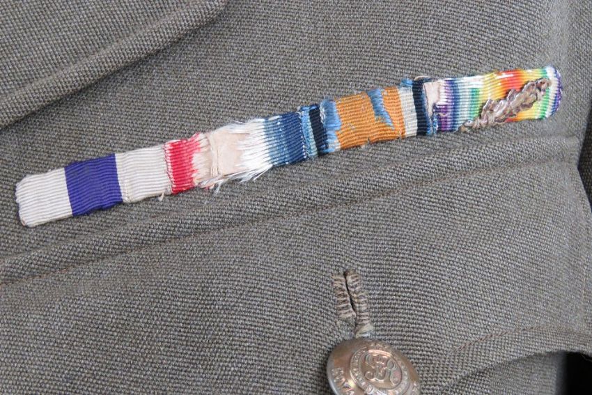 A WWII British Army Brigadiers uniform having brass buttons and badges upon, complete with Sam Brown leather belt and peaked cap. Together with a Carley & Clemence Ld pocket watch having broad arrow to case back, black dial and subsidiary seconds dial.