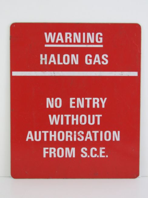 Metal sign 'Warning Halon Gas No Entry Without Authorisation From S.C.E.', 30 x 25cm.