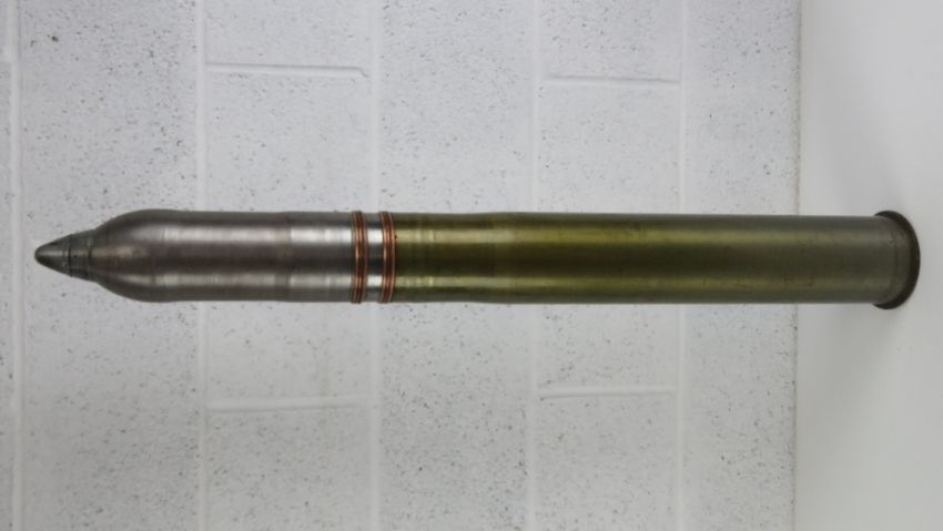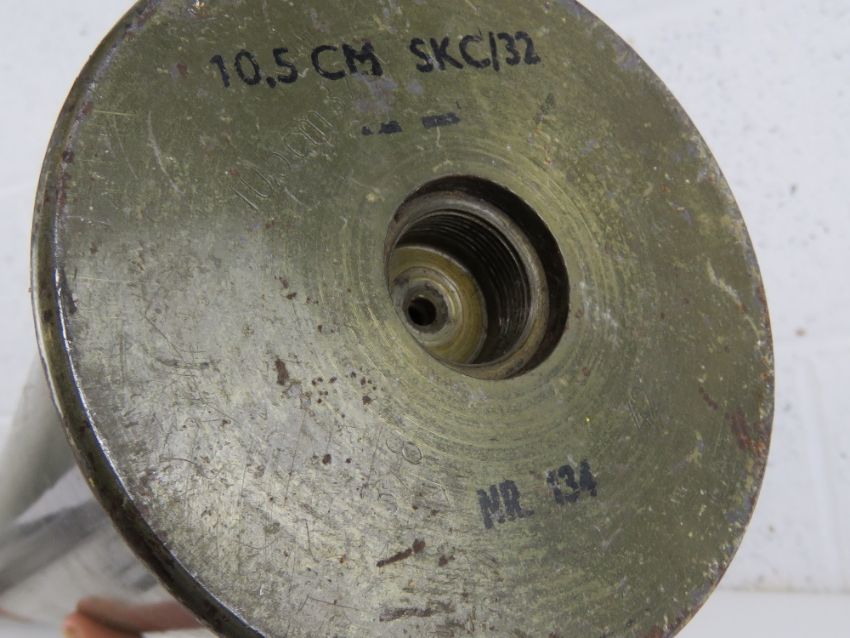 An inert WWII German 105mm Naval SK C/32 'Admiral Scheer' round, shell having German marks upon and dated 1942, fuse dated 1944.