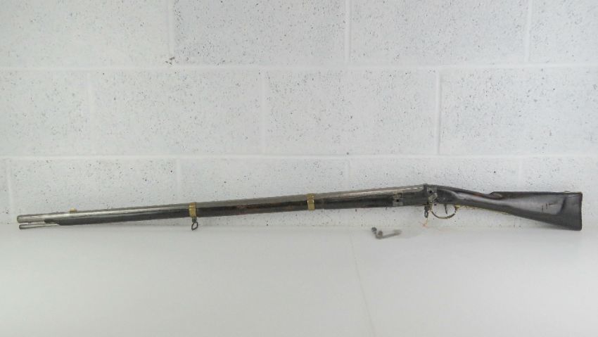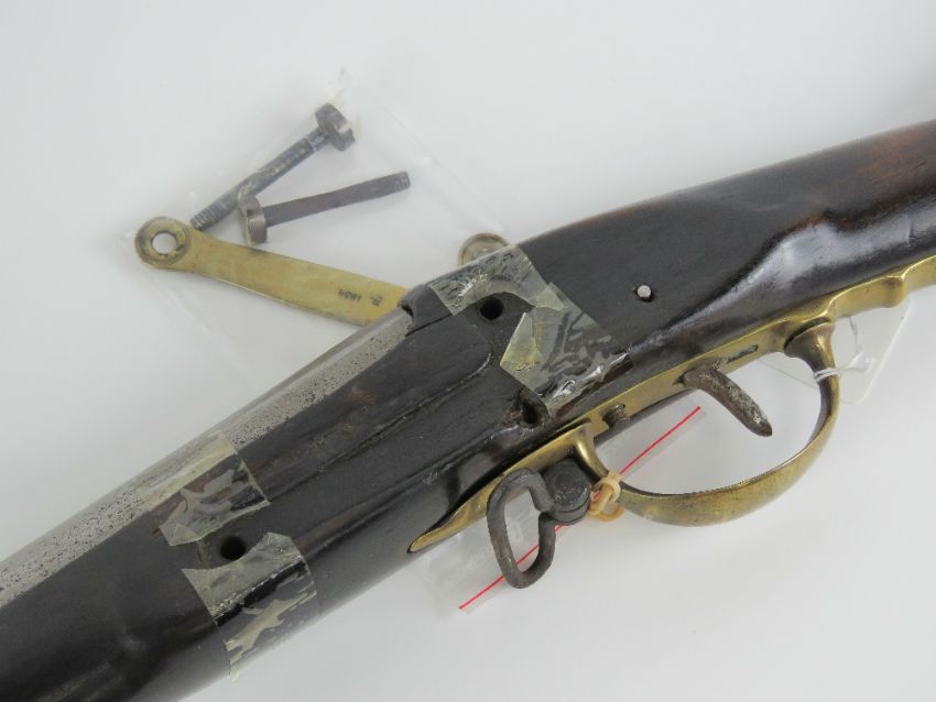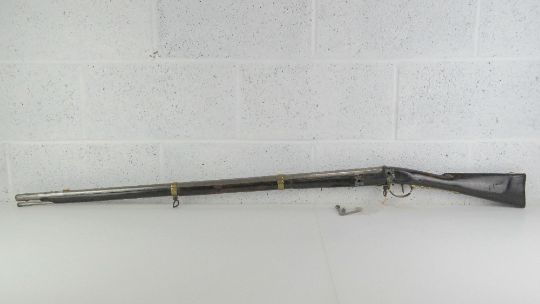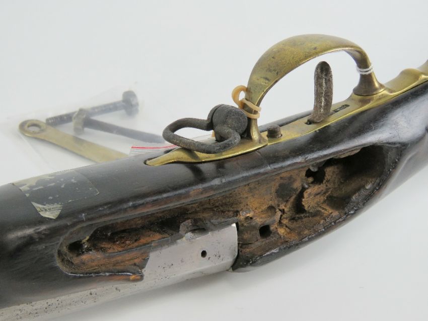 An obsolete calibre British gun barrel and woodwork without block.