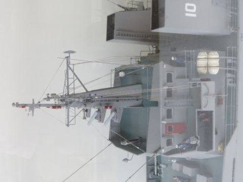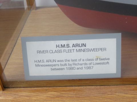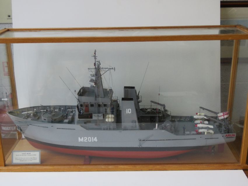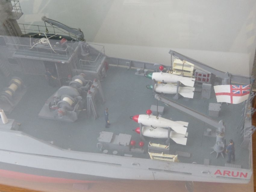 An Impressive model of HMS Arun River Class Fleet Minesweeper within glazed oak case. HMS Arun was the last of a class of twelve Minesweepers built by Richards of Lowestoft between 1980 and 1987. Case measuring 103 x 28.5 x 55cm.
