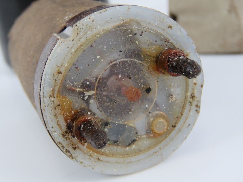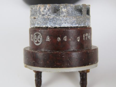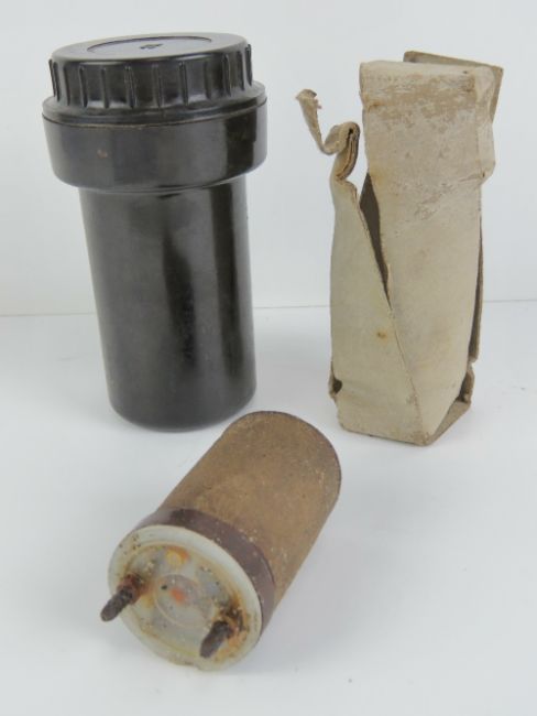 A WWII German bakelite fuse and fuse pot in stores packaging, dated 1942 with JWV makers mark.
