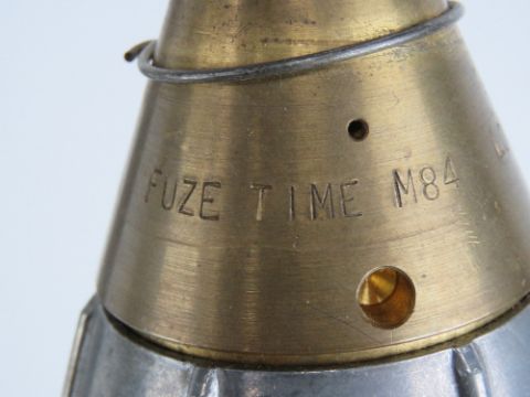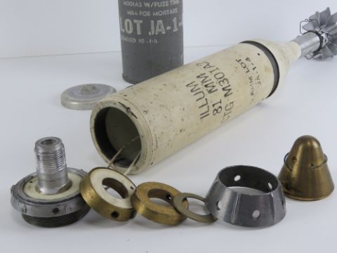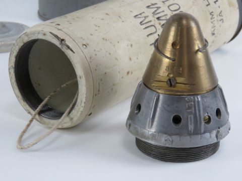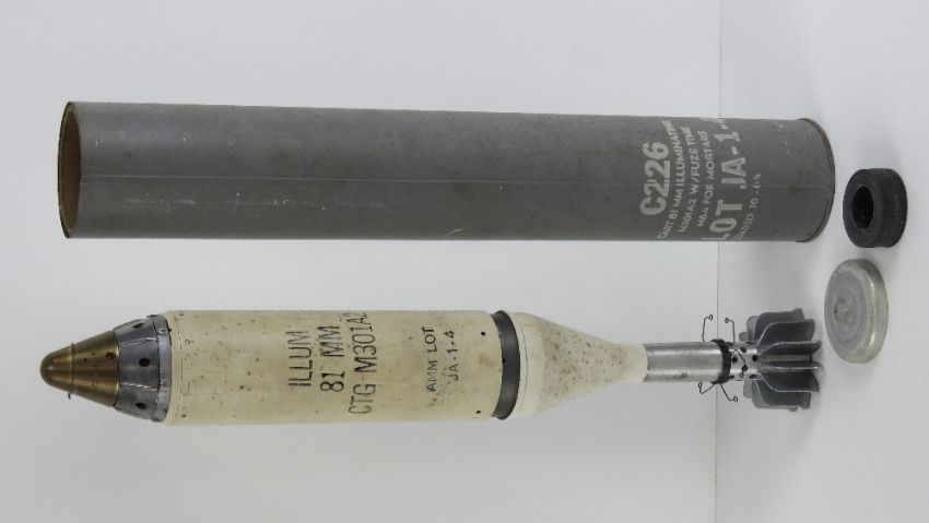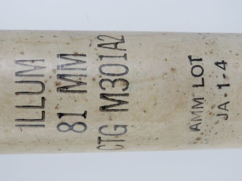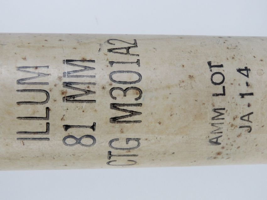 An inert British 81mm M301A2 Illumination Mortar with fuse in transit case (case missing the cap), stencilling to case and mortar, M84 fuse timer.
