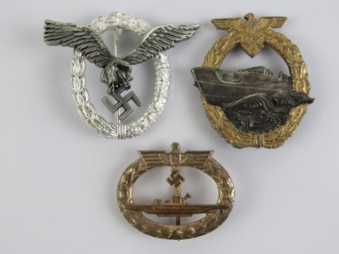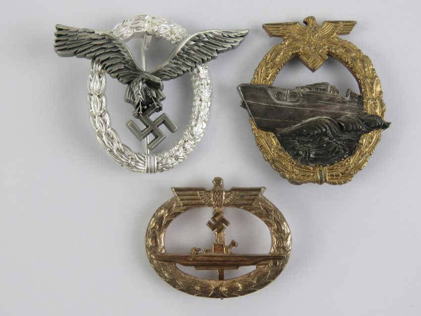 Three reproduction WWII German badges; Pilots, E-Boat and U-boat.