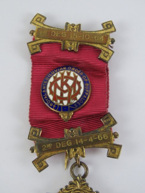 The Royal Antediluvian Order of Buffaloes (RAOB); A HM silver jewel with medal ribbon for 'Bro Joseph A Simmons, Pax Lodge No.7402 Exalted 25-9-69'. Hallmark indistinct.