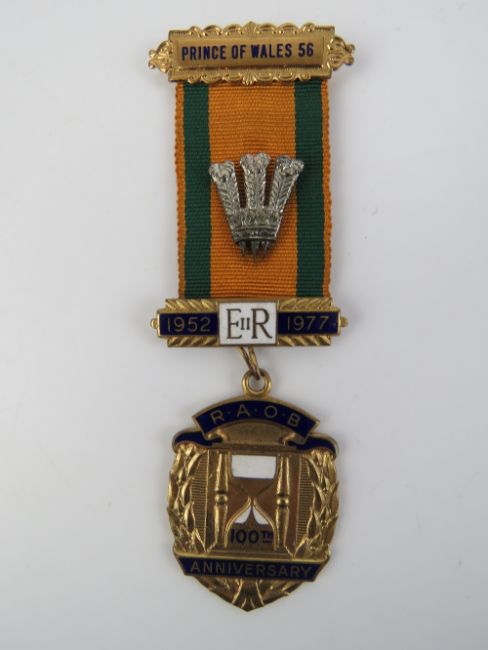 The Royal Antediluvian Order of Buffaloes (RAOB); A 100th Anniversary jewel medal with ribbon for Prince of Wales Lodge 1878-1978 made by Parry Birmingham.