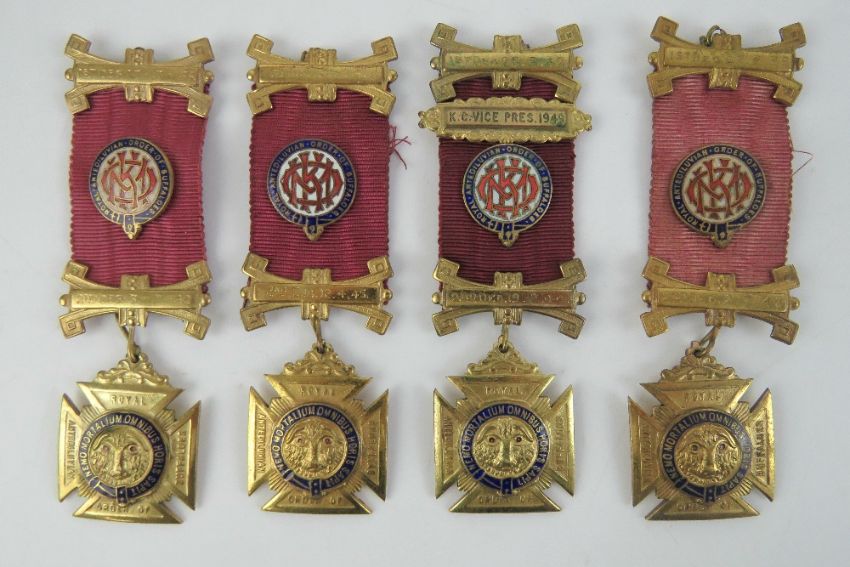 The Royal Antediluvian Order of Buffaloes (RAOB); Four KOM jewel medals with ribbons, c1936-48 being Perseverance Lodge No1092, Runcova Lodge No 1733, Jubilee Lodge No7630, and Prince of Wales Lodge No1967.